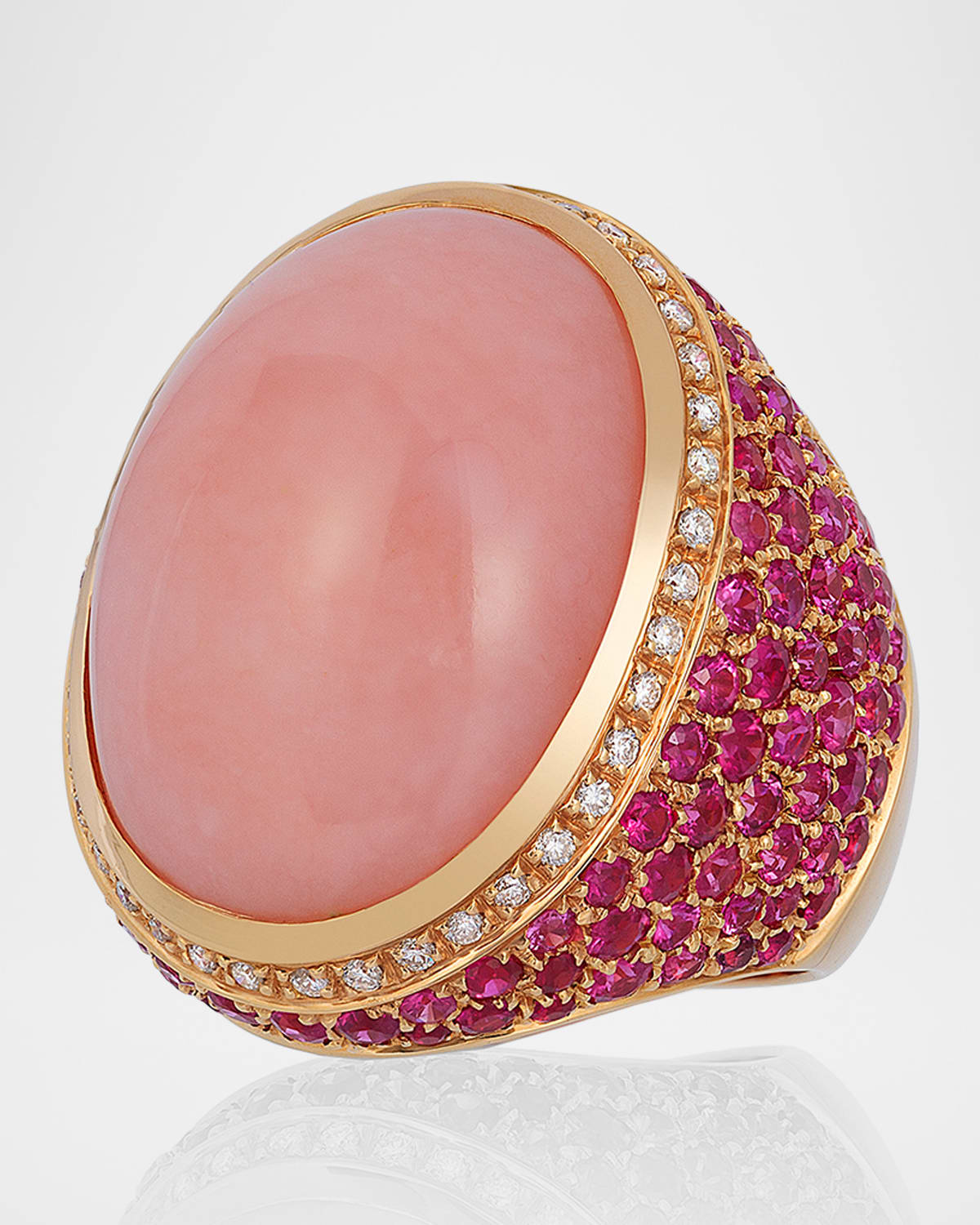 Andreoli cocktail ring Approx. ring size 7; 1.25" length x 1.0" width Polished 18karat rose gold Oval opal with a diamond halo Each side is set with pink sapphires Sapphire total carat weight: 5.35 Opal total carat weight: 3.80 Diamond total carat weight: 0.35 Made in Italy