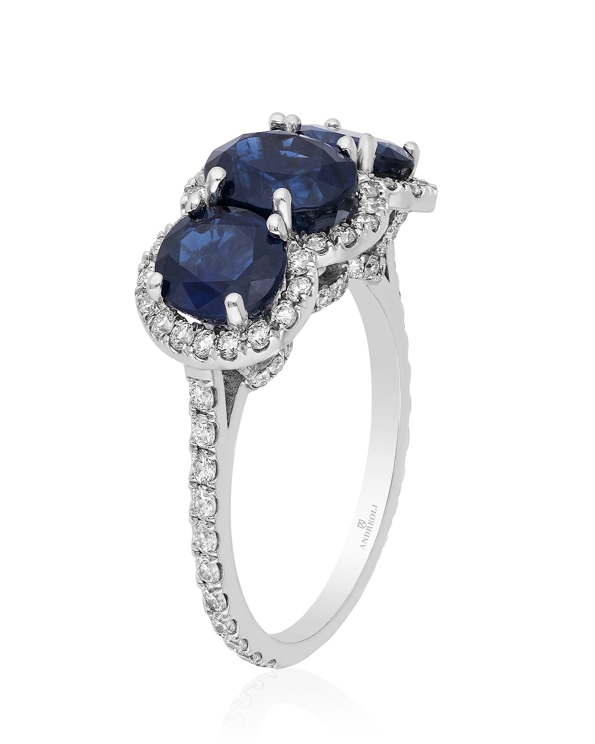 Andreoli ring 18karat white gold Pavéset white diamonds Three blue sapphire ovals 1.08 total diamond carat weight 6.15 total sapphire carat weight Made in Italy