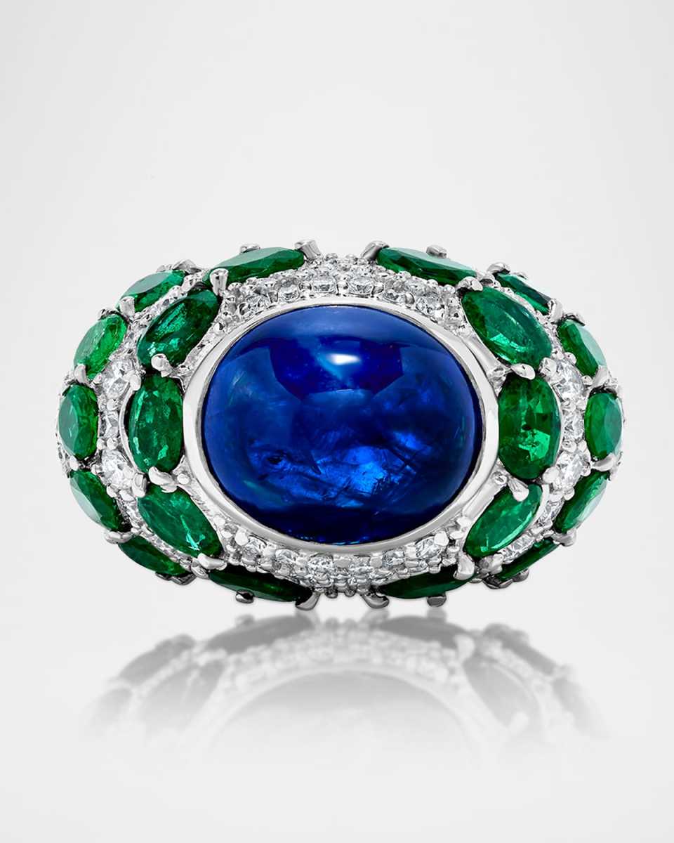 Andreoli cocktail ring Polished 18karat white gold One blue sapphire cabochon Pavéset diamonds and emeralds 1.36 total diamond carat weight 5.04 total emerald carat weight 12.5 total sapphire carat weight Made in Italy