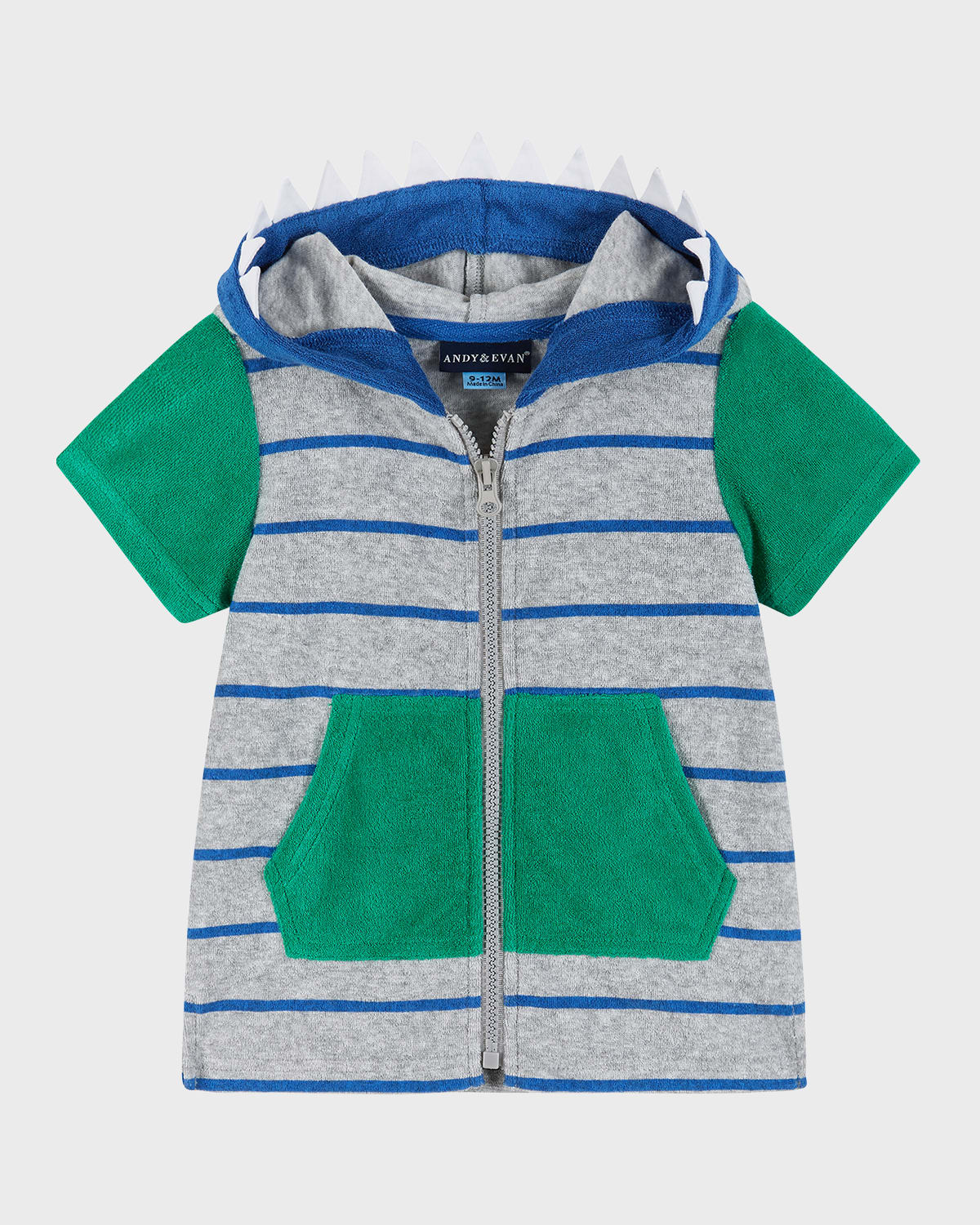 Andy amp; Evan terry coverup featuring an adorable hood with dinosaur jersey spikes Hooded; zip front Short sleeves Front kangaroo pockets Button closure Cotton/polyester Machine wash cold Imported