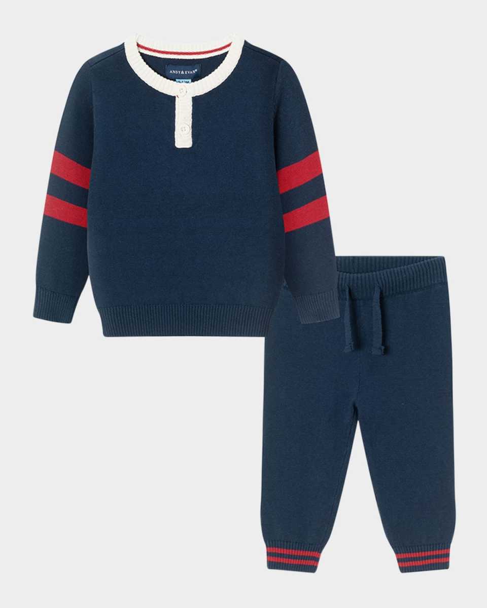 Andy amp; Evan sweater with striped sweater and matching pants set Round neckline Long sleeves Button placket Banded cuffs and hem Elasticized drawstring waistband Ribbed trim Relaxed fit Cotton Machine wash Imported