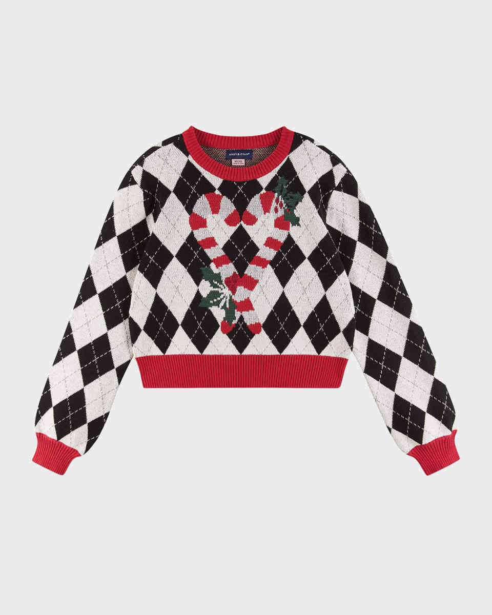 Andy amp; Evan argyleprint with candy cane graphic at the chest Round neckline Long sleeves Cropped length Banded cuffs and hem Contrast ribbed trim Slipover style Cotton Unlined Machine wash Imported
