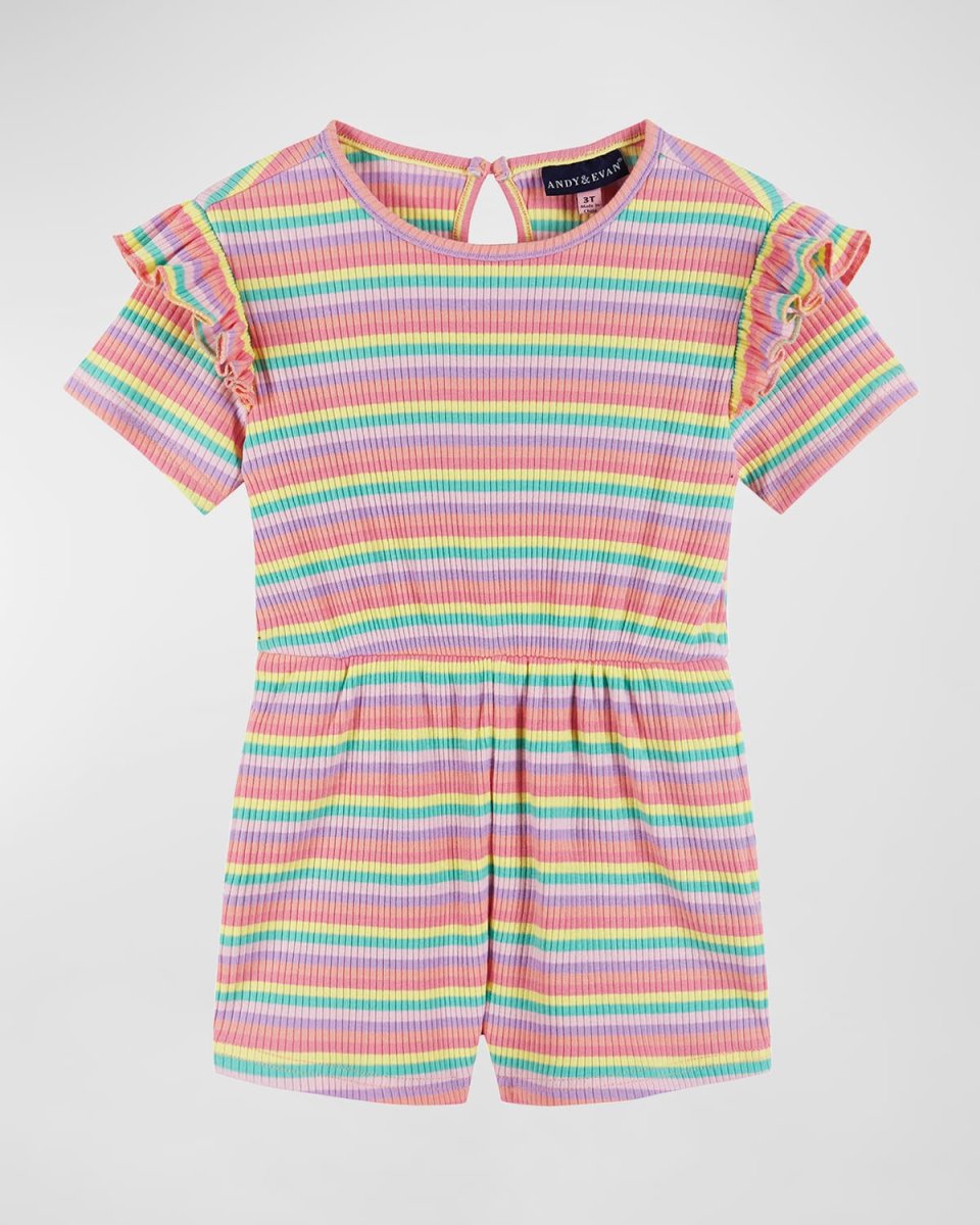 Andy amp; Evan knit romper in multicolor stripes Round neckline Short sleeves Keyhole closure at back Ruffle trim Machine wash cold, do not bleach, tumble dry medium, cool iron from inside if needed, do not dry clean Promodal® rayon/polyester Imported