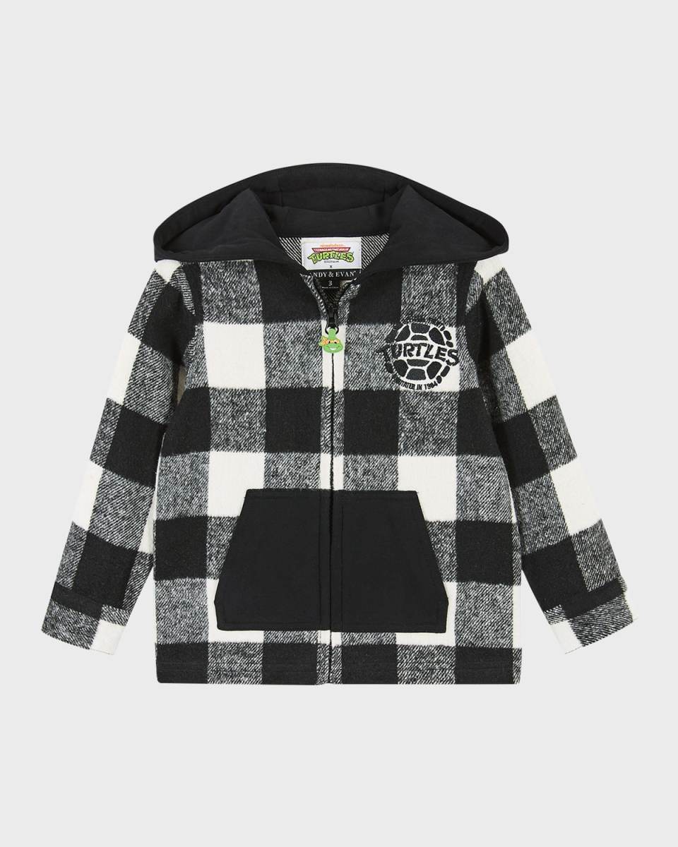 Andy amp; Evan x Teenage Mutant Ninja Turtles checkprint shacket with turtle graphic at back Hooded neckline Long sleeves Full zip front Split kangaroo pocket Banded cuffs and hem Snap front Polyester Machine wash cold Imported
