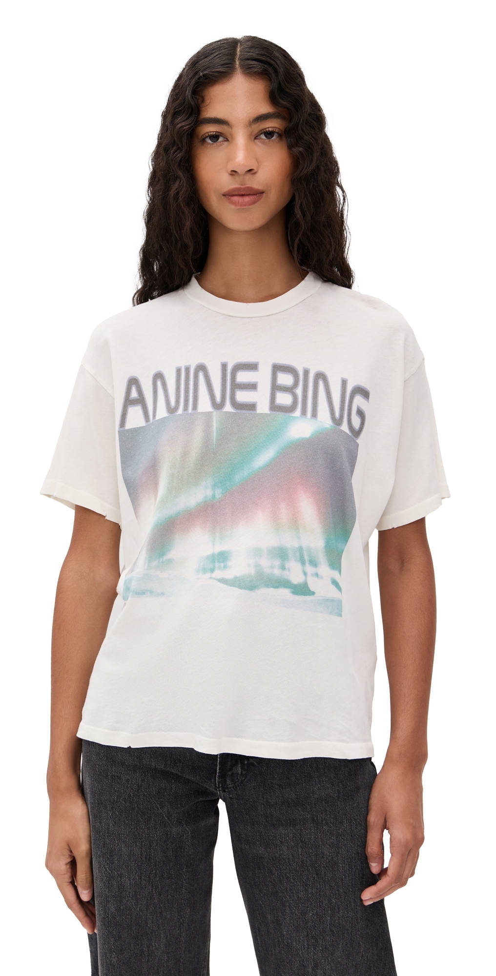 Fabric: Lightweight, super-stretch jersey. Logo print and northern lights graphic. Ribbed trim and lightly distressed edges. Crew neck. Short sleeves. Shell: 100% cotton. Wash cold. Imported, Turkey. Measurements: Measurements from size XS Length: 22.75in / 58.0cm, from shoulder
