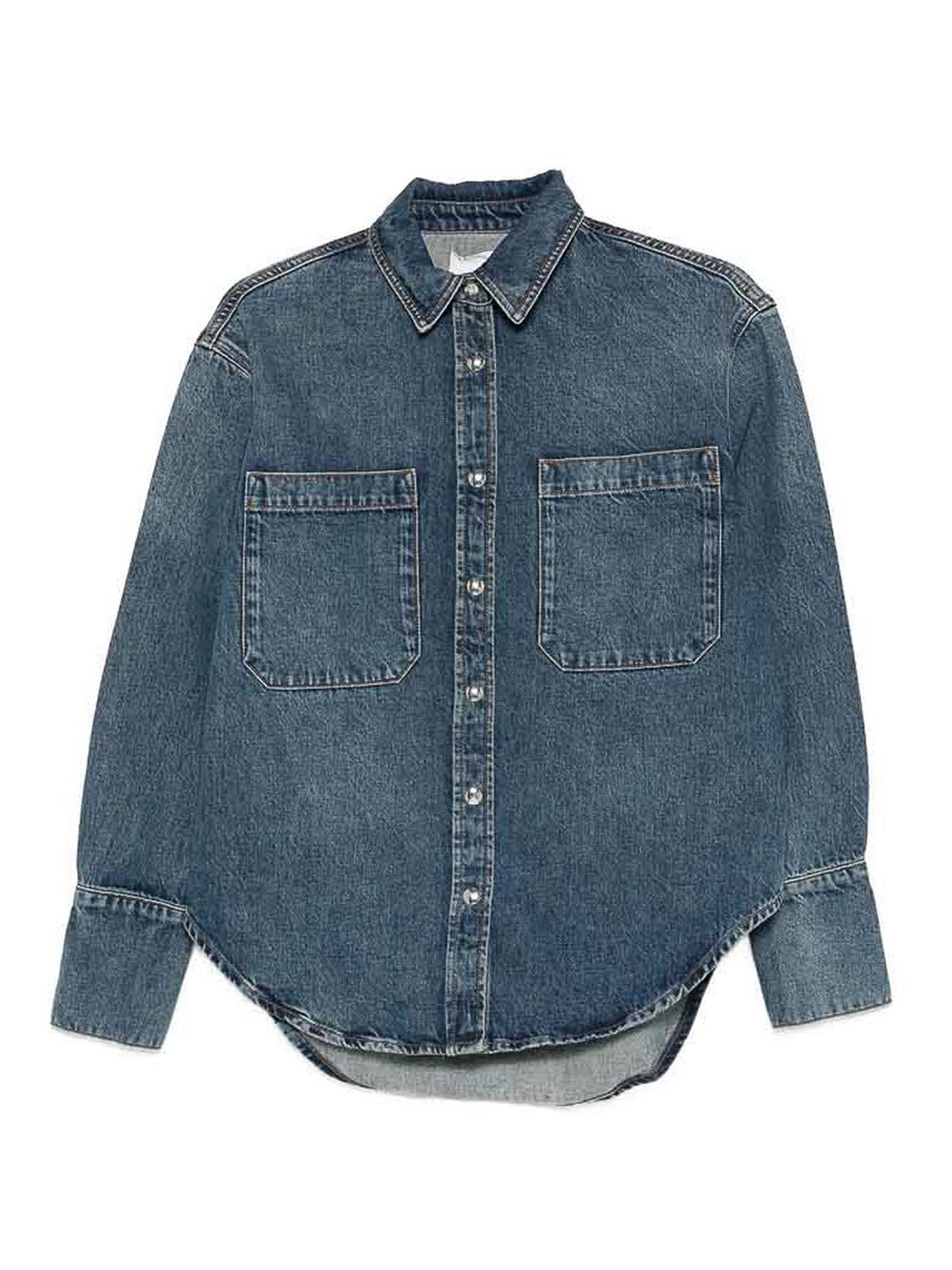 Bouton bleu indigo, manches longues, poignets boutonnés, deux poches plaquées sur la poitrine, ourlet incurvé