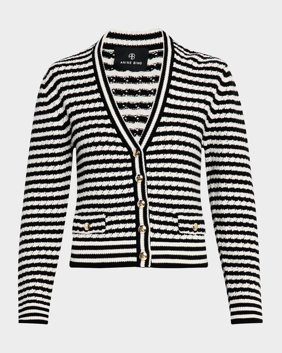 ANINE BING "Gwen" elevated pointelleknit cardigan crafted in a midweight, striped woolcashmere blend V neckline Long sleeves Two functional flap pockets Cropped hem Contrasting ribbed trim Button front closure Virgin wool/cashmere Dry clean Imported