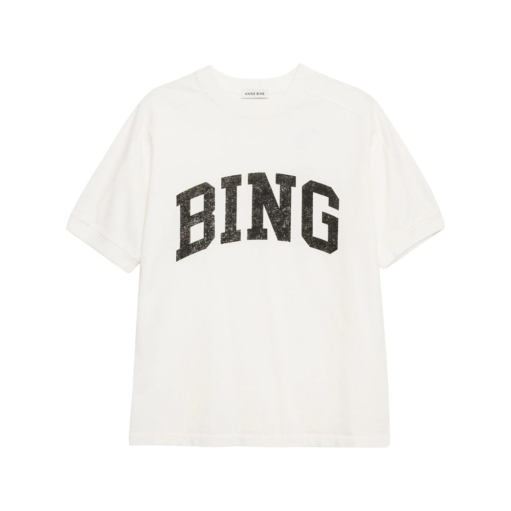 ivory white cotton jersey texture crew neck short sleeves logo print to the front straight hem
