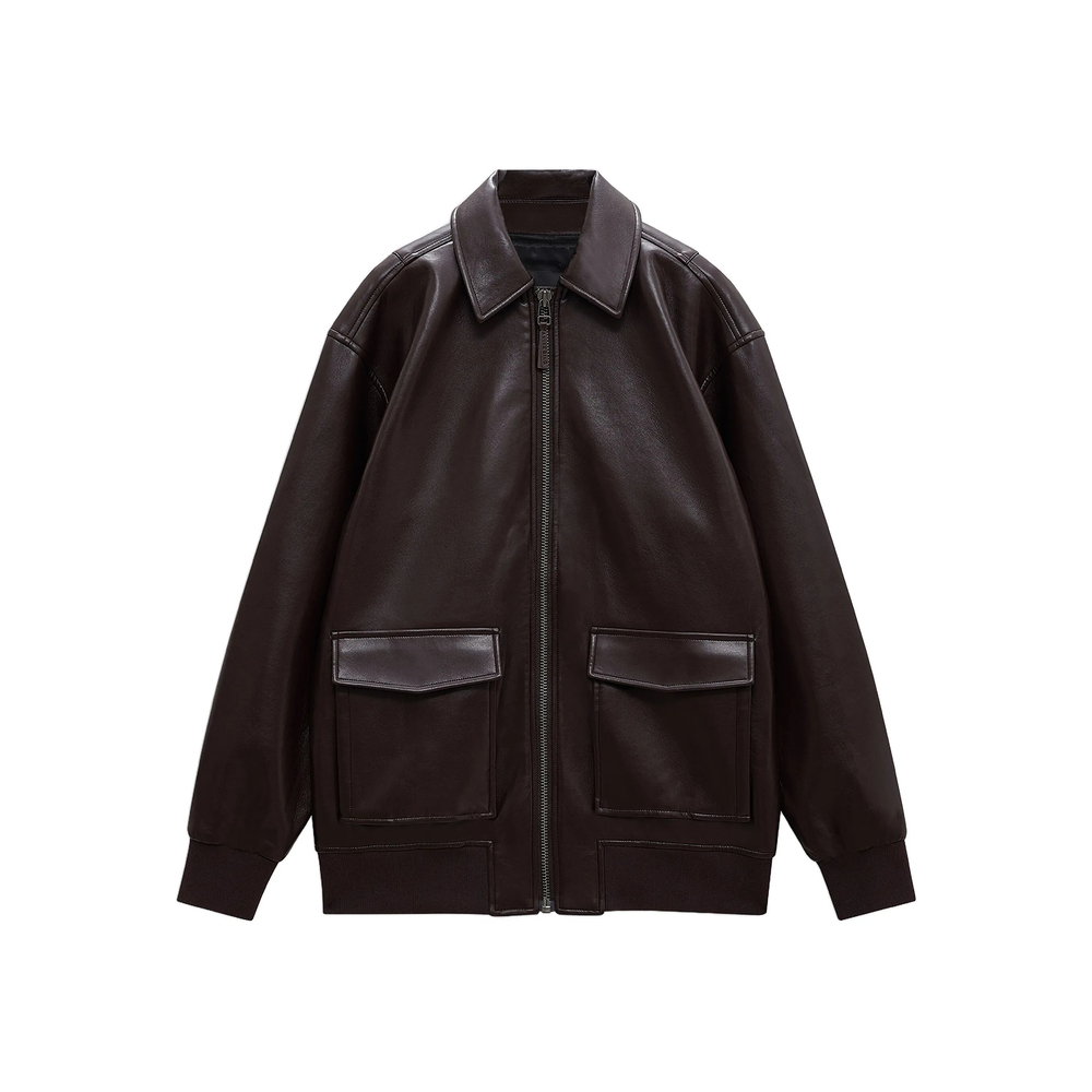 brown front zip fastening two front flap pockets classic collar long sleeves