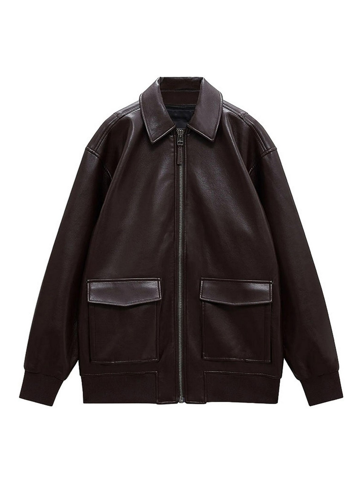 Fermeture éclair marron à deux poches à rabat, col classique, manches longues