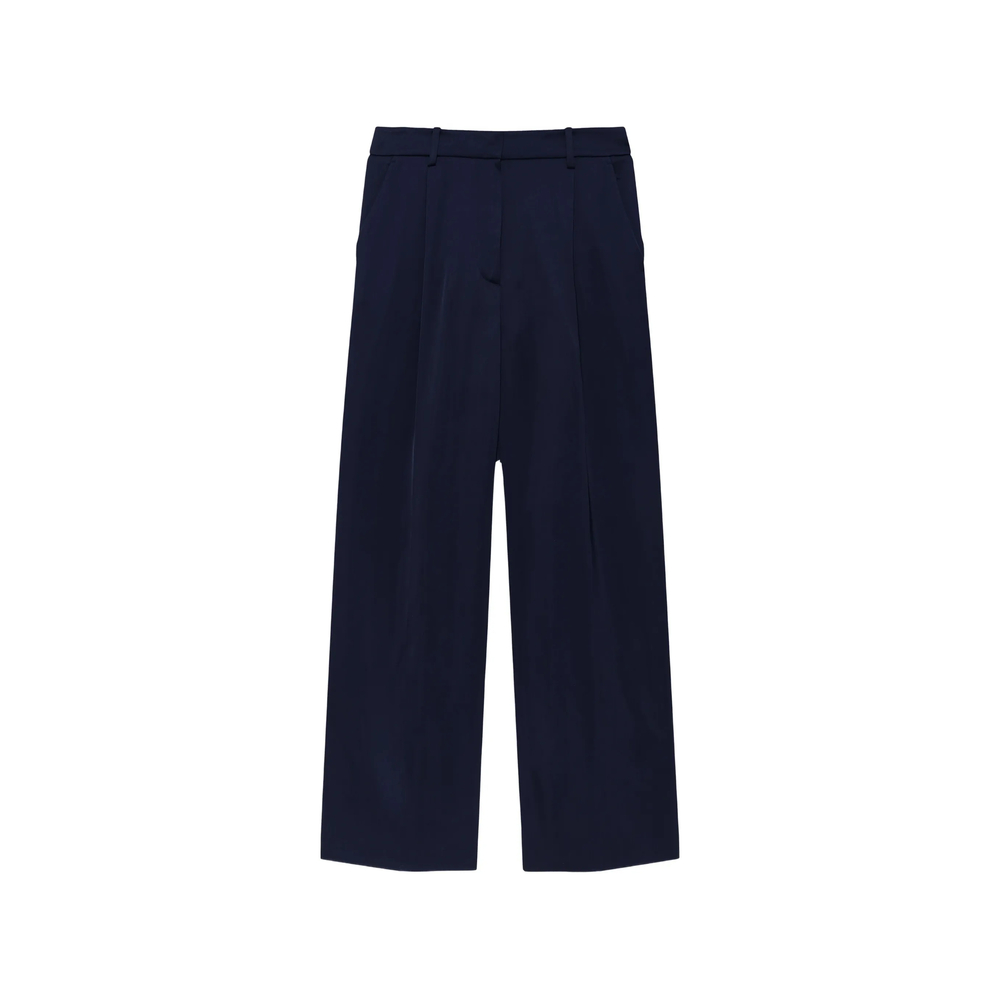 navy blue belt loops side diagonal pockets back welt pockets concealed front fastening