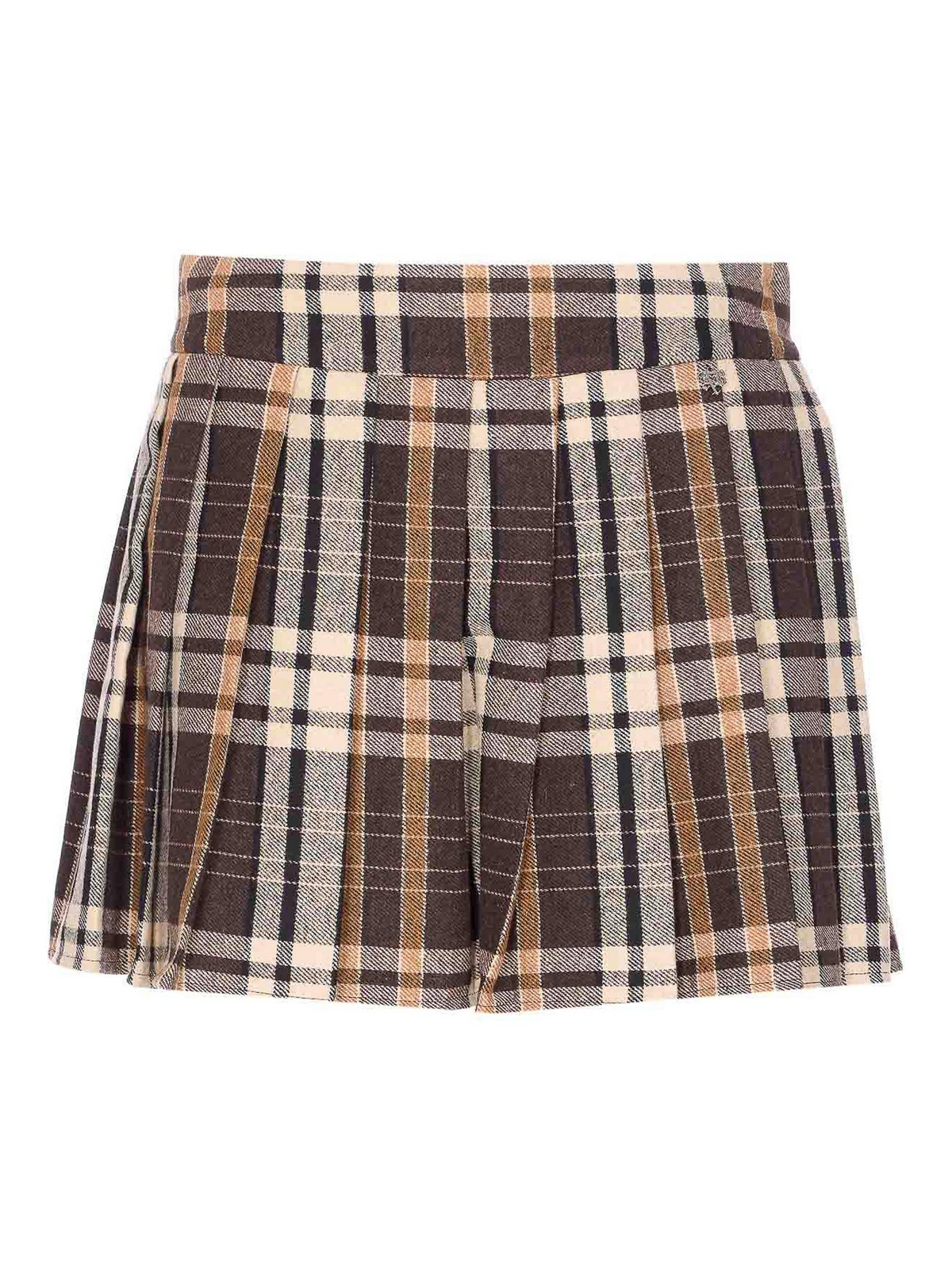 Mini-jupe Aniye by Moka Gwen, zippée et boutonnée au dos, motif à carreaux, plissé. Nom de la couleur du créateur: marron