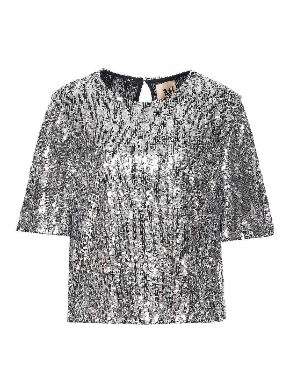 Haut Aniye by Lulu, col rond, boutons au dos, paillettes sur toute la surface. Nom de la couleur du créateur: argent