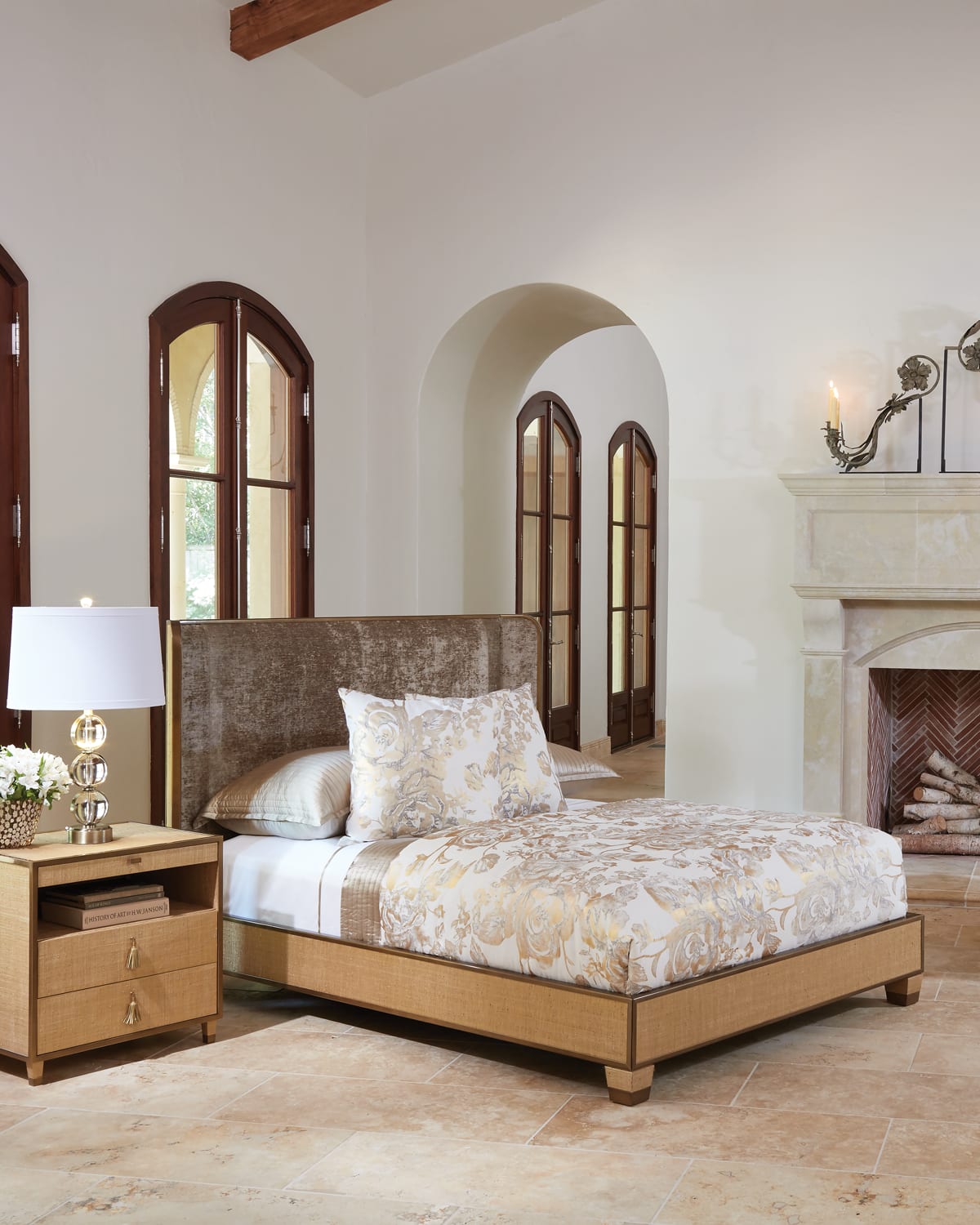 Wood raffia, metal and velvet fabric. Light assembly may be required. 84.3"W x 73.5"D x 52"T. Imported. Boxed weight, approximately 428 lbs.