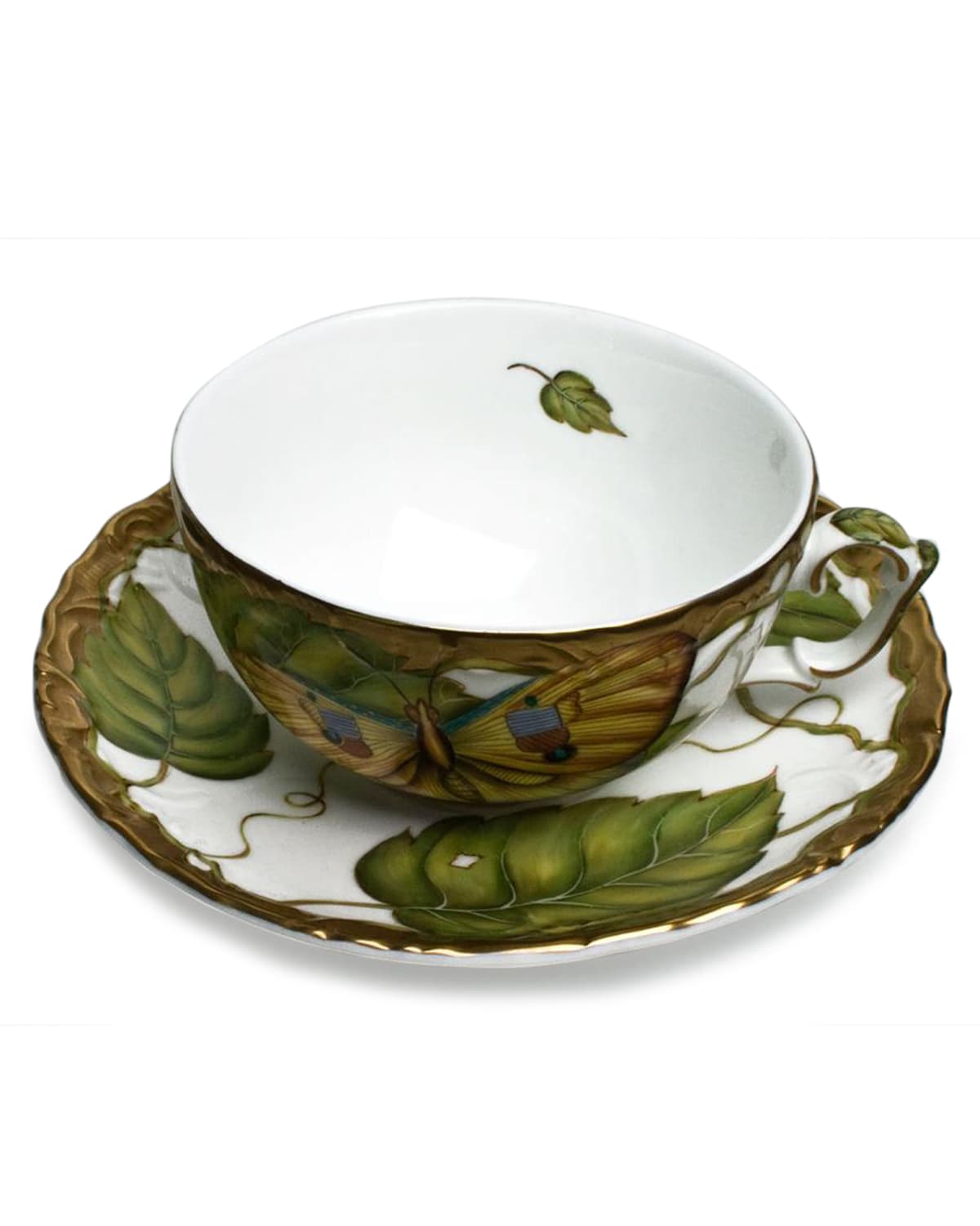 Handpainted porcelain teacup and saucer set. Holds 8 ounces. Hand wash. Made in Hungary. This is a special order pattern. If not in stock, please allow up to 4 months for creation and delivery.
