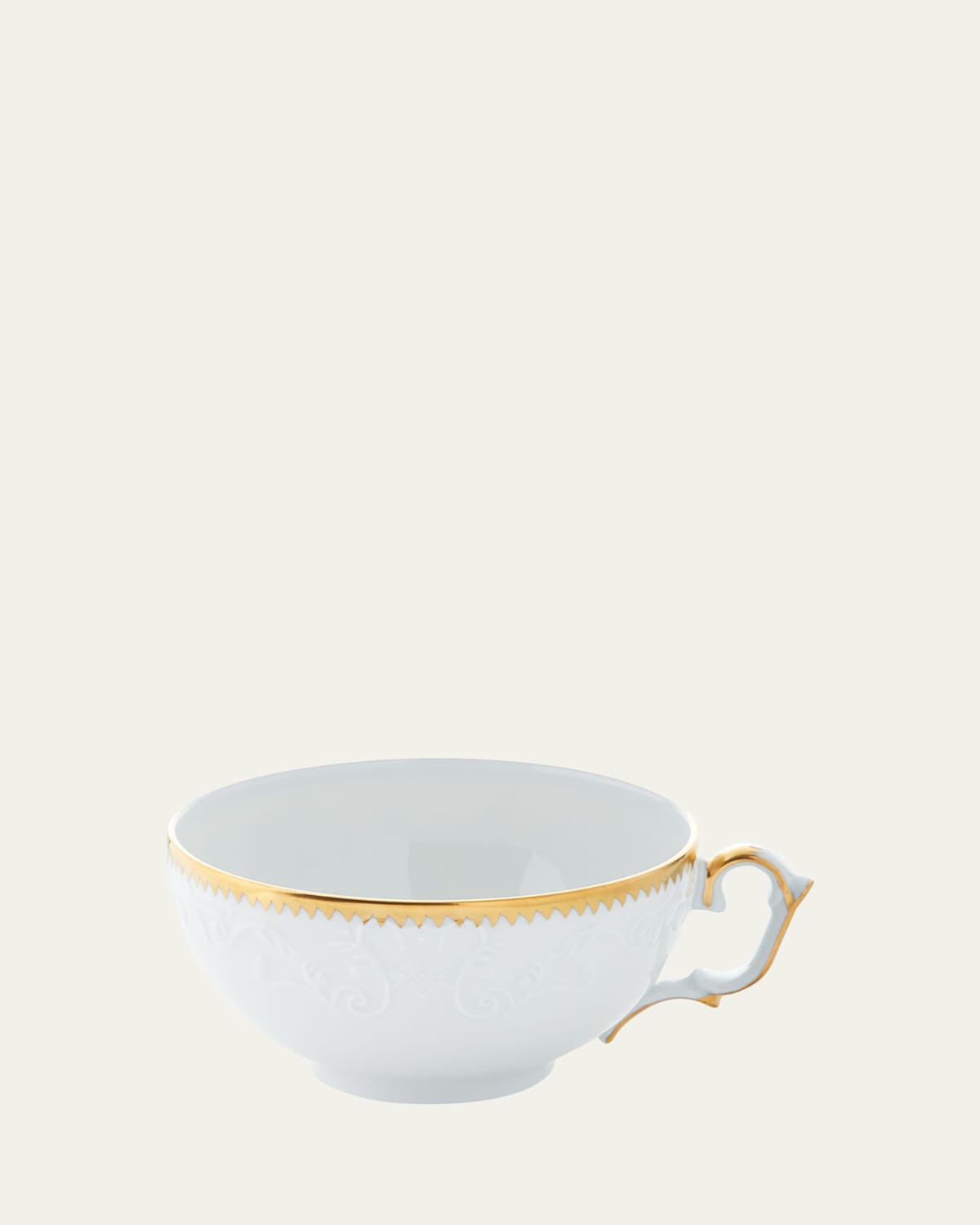 White porcelain with goldtone edge. Holds 8 ounces. 3 3/4" diameter. Dishwasher safe. Made in Portugal.
