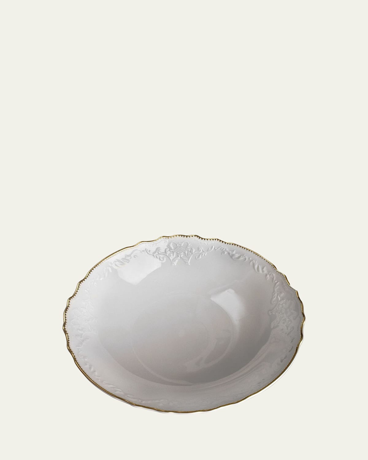 White porcelain dish with goldtone edge. Holds 51.5 ounces. Hand washing recommended; not suitable for use in microwave. Imported.