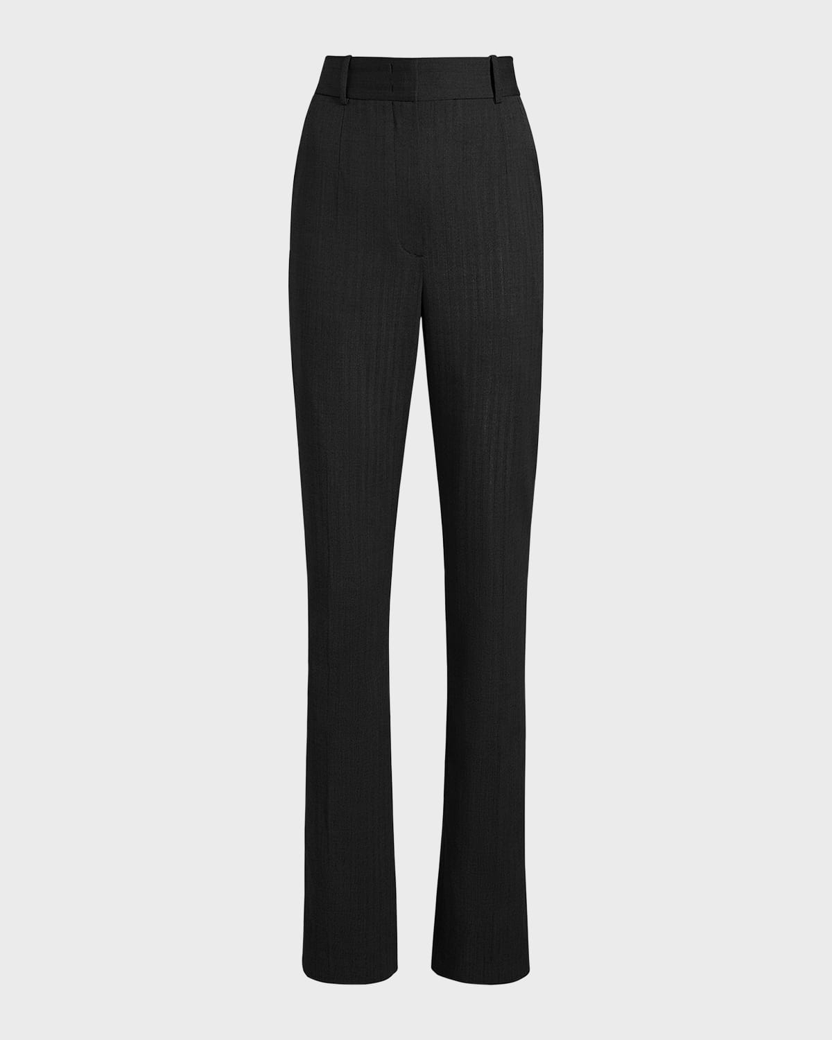 Another Tomorrow trousers with creased legs Approx. measurements: 8.4" rise; 35" inseam; 43.5" outseam Mid rise sits high on hip Side slip pockets; back welt pockets Straight legs Full length Tab/zip fly; belt loops Wool Cupro/elastane lining Dry clean Made in Italy