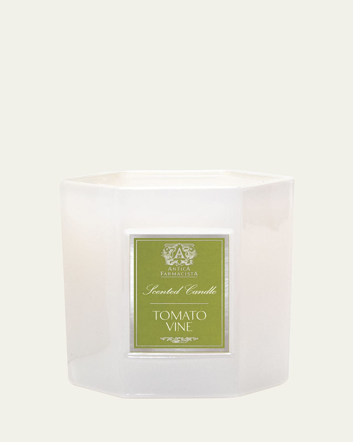 A green scent, capturing the essence of a summertime garden. Tomato vines, dotted with ripe juicy tomatoes, herbaceous basil, cut grass, hints of black pepper, and Meyer lemon.each ingredient evoking the ripe fruit of summer with its earthy aroma. Our signature soft white hexagonal glass, filled with our soyparaffin wax blend, results in 60 hours of beautifully scented illumination. Each decorative box includes a set of Antica's signature matches. 9 oz. / 255