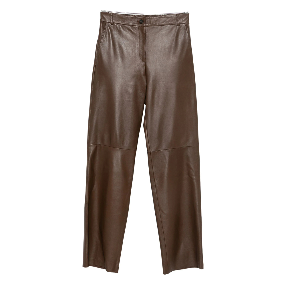brown leather front button and zip fastening elasticated waistband belt loops straight leg side slit pockets rear welt pockets