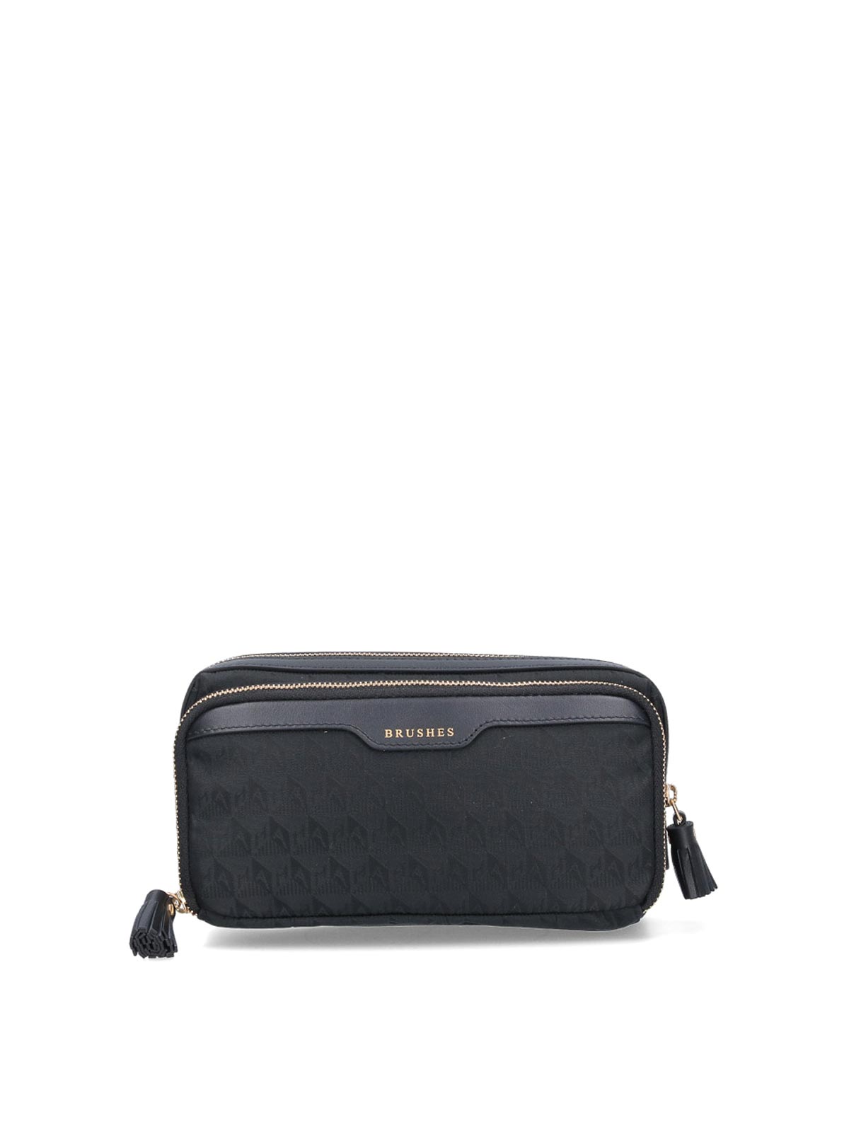 Pochette à pinceaux Anya Hindmarch, fabriquée en Econyl, fermeture éclair noire sur le dessus, une poche avant zippée, des pinceaux dorés, impression sur le devant, un compartiment principal