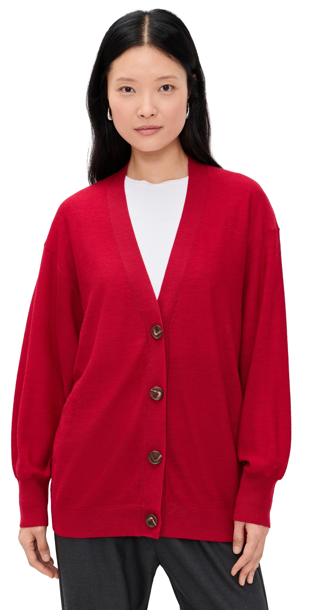 Fabric: Mid-weight knit with stretch. Ribbed edges. Off center button allowing for asymetrical silhouette. V neck. Long sleeves. Shell: 100% merino wool. Dry clean. Imported, China. Measurements: Measurements from size S Length: 28.25in / 72.0cm, from shoulder