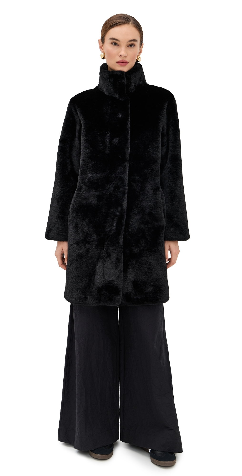 Fabric: Mid-weight, non-stretch faux fur. Mock neck. Long sleeves. Snap placket. Welt front pockets. Shell: 100% polyester. Lined. Lining: 100% polyester. Dry clean. Imported, China. Measurements: Measurements from size XS Length: 35in / 89.0cm, from shoulder