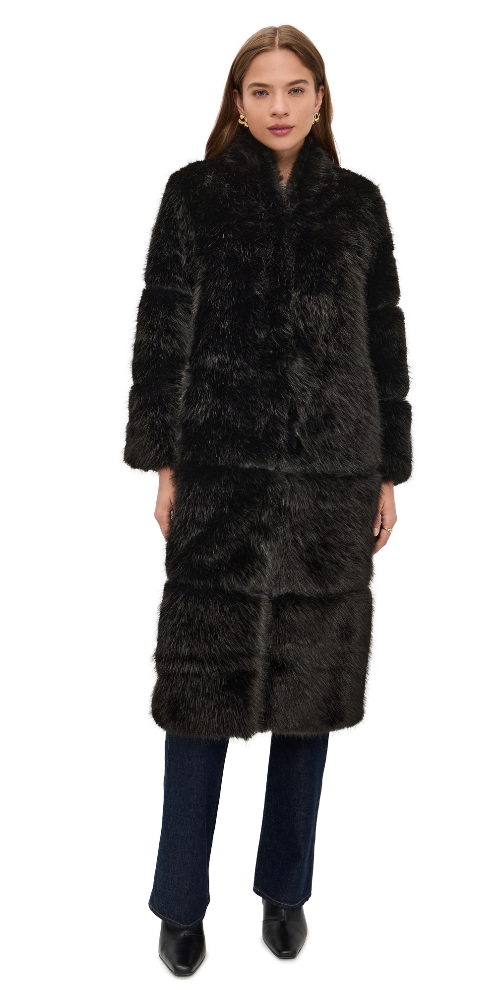 Fabric: Heavyweight, non-stretch faux fur. Mock neck. Long sleeves. Hook-and-eye placket. On-seam side pockets. Shell: 85% polyester/15% recycled polyester. Lined. Lining: 100% recycled polyester. Dry clean. Imported, China. Measurements: Measurements from size XS Length: 41.75in / 106.0cm, from shoulder