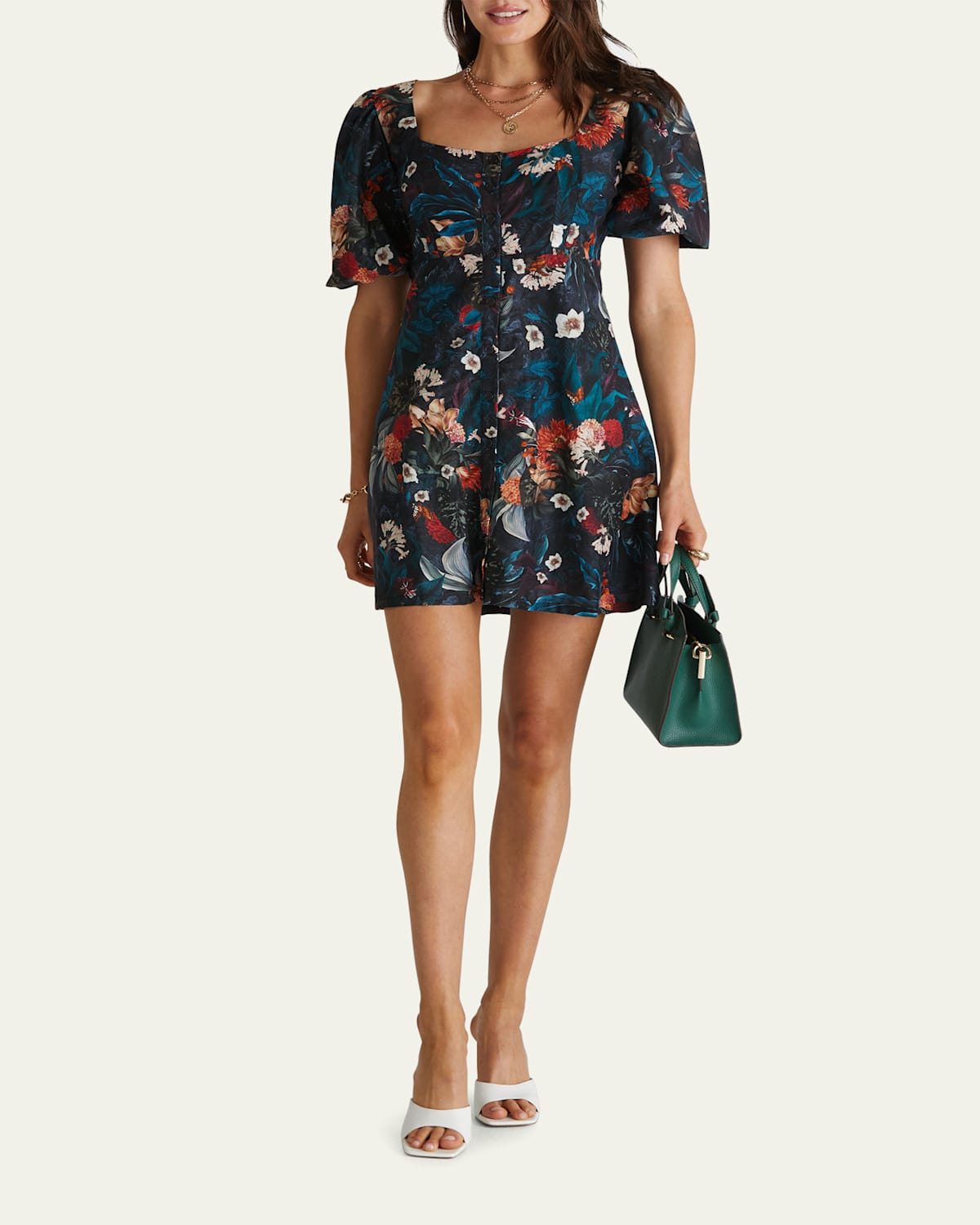 Aqua Blu "Vanessa" floral printed dress Square neckline; button front Short puff sleeves; elastic cuffs Aline silhouette Mini length Cotton/silk Imported