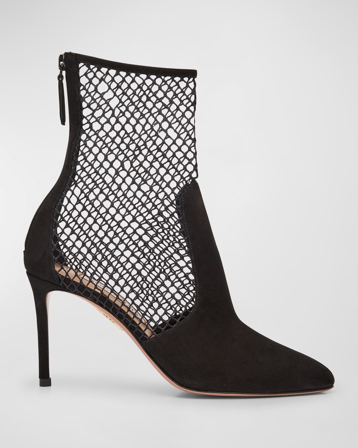 Aquazzura "Brera" suede and sheer mesh ankle booties 3.25 in / 85 mm stiletto heel Point toe Back zip eases dress Lining: Goat leather Made in Italy