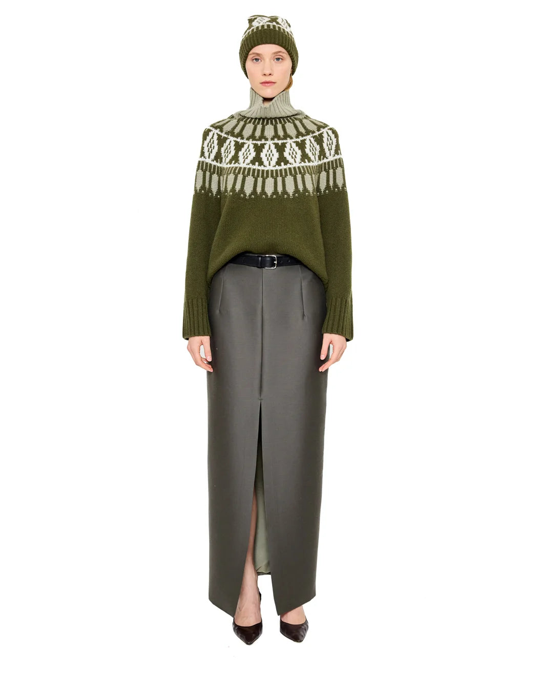 The Whistler Sweater in Dark Olive by Arch4 is a turtleneck, printed sweater featuring a classic winter-inspired design crafted in luxurious cashmere with an oversized sleeve and ribbed trims. 100% GOTS certified Cashmere #KNJP24234B Dry Clean