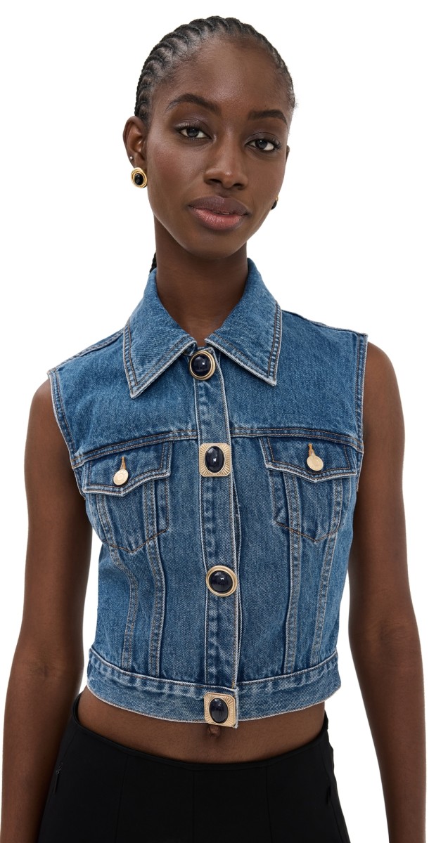 Fabric: Mid-weight, non-stretch denim. Gold-tone buttons with crystal embellishments. Cropped profile. Collared neck. Sleeveless. Adjustable button-tabs at waist. Flap breast pockets. Shell: 100% cotton. Dry clean. Imported, China. Measurements: Measurements from size 0 Length: 17.75in / 45.0cm, from shoulder