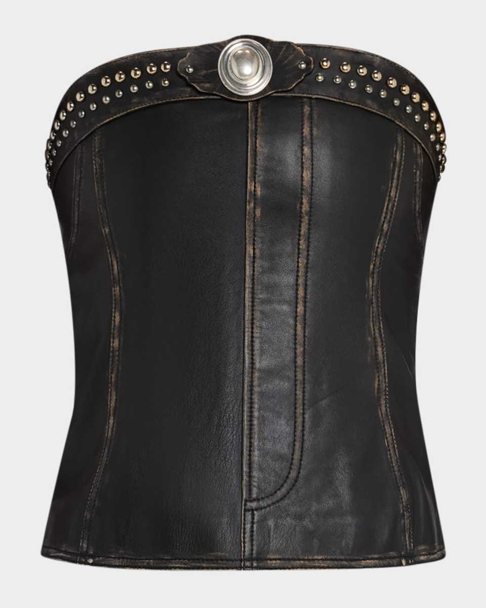 AREA calf leather top featuring a stud embellished neckline Strapless neckline Sleeveless Fitted Back zip Leather Imported