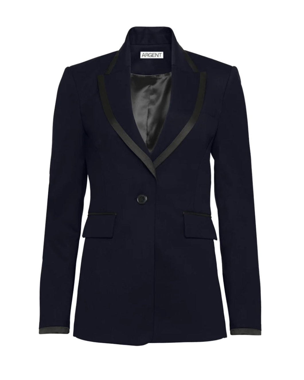 The Colorblocked Sculpted Blazer in Midnight and Black by Argent is a sculpted blazer featuring contrast black silk piping and cinched waist, crafted in seasonless wool. Perfect for an elevated office look. Material: 98% Wool 2% Elastane, Seasonless Wool from Italy Pair back to the matching trouser for a coordinated set. Fit: True to size Made in USA Style: #FW25-0156 Care: Dry Clean Only
