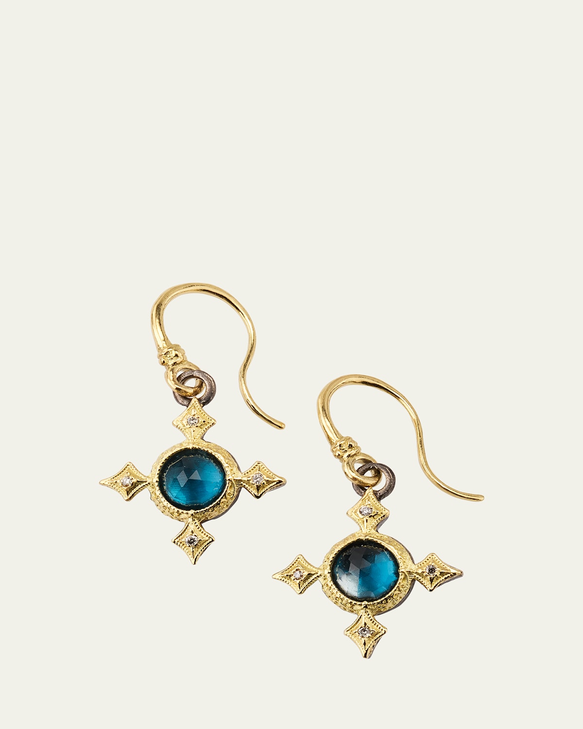 Armenta earrings with bezelset blue topazes 18karat yellow gold and oxidized sterling silver Crivelli stations with eight champagne diamonds 0.04 total diamond carat weight For pierced ears Hook clasp Made in USA