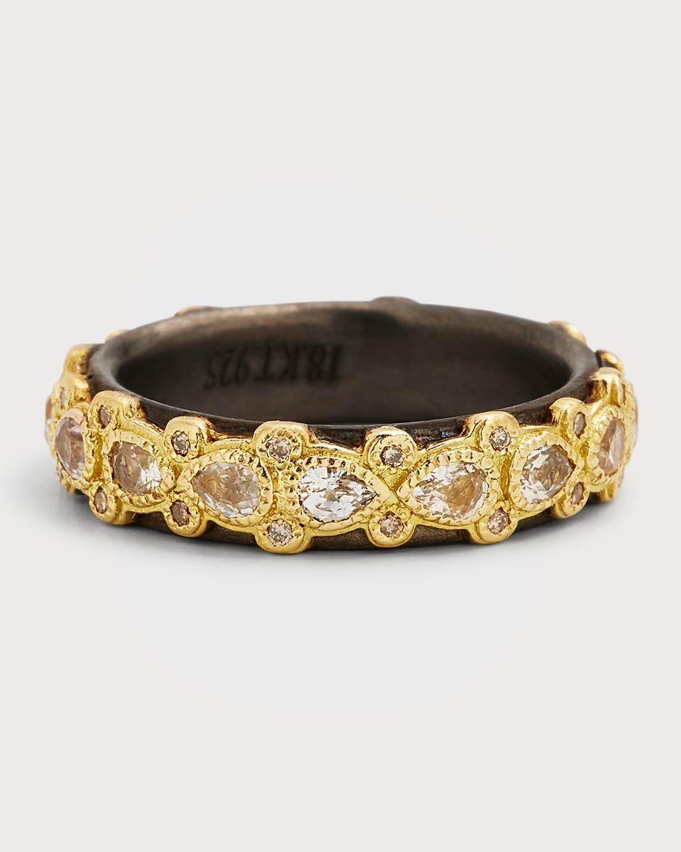 Signature Armenta oxidized sterling silver. 18karat recycled yellow gold settings. Pearcut, white pave sapphire. Roundcut, white pave diamonds. Diamonds, 0.13 total carat weight. Sapphires, 1.60 total carat weight. Made in USA.