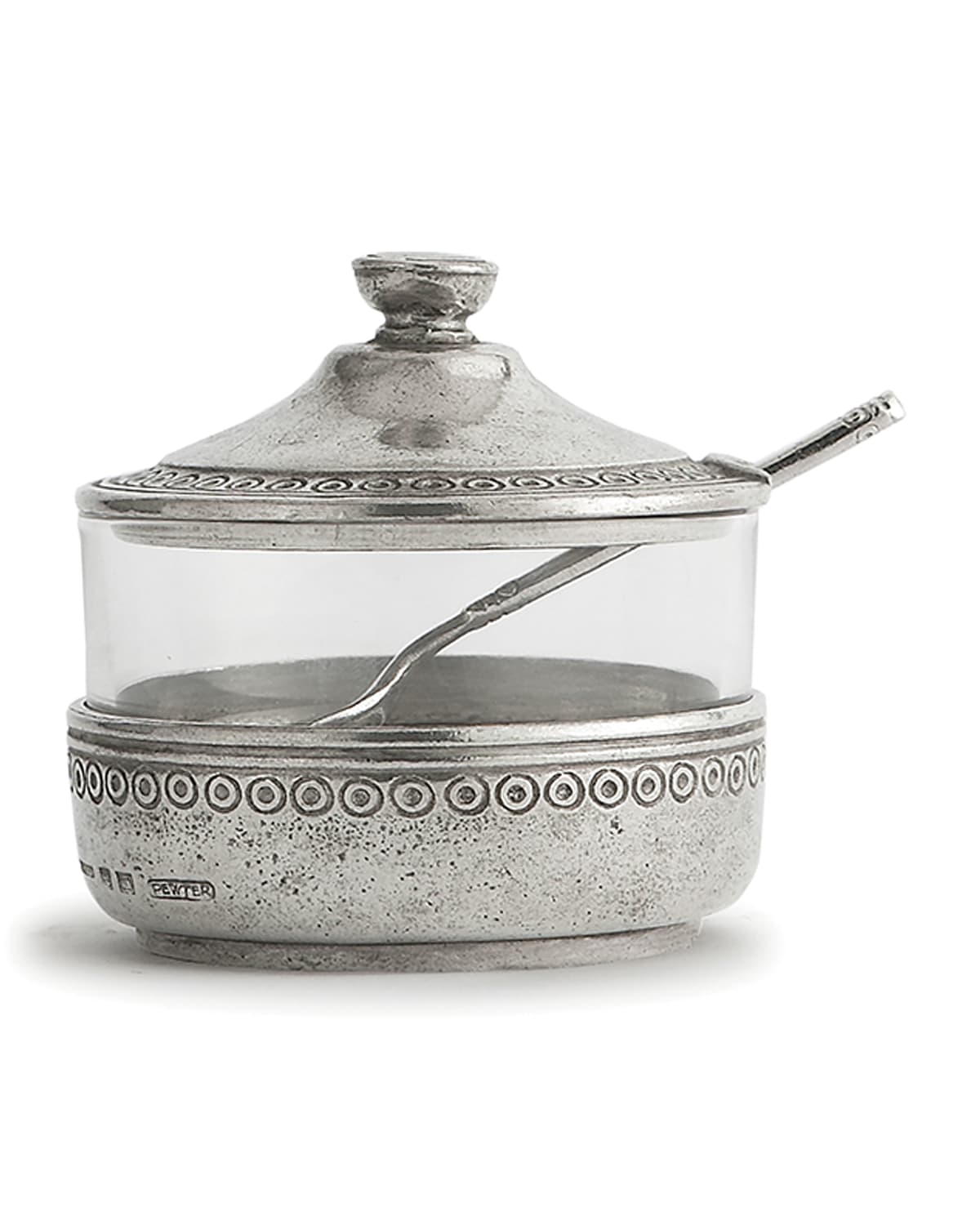 Sugar pot with spoon. Made of pewter and glass. Approx. 3.5"Dia. x 4"T. Made in Italy.