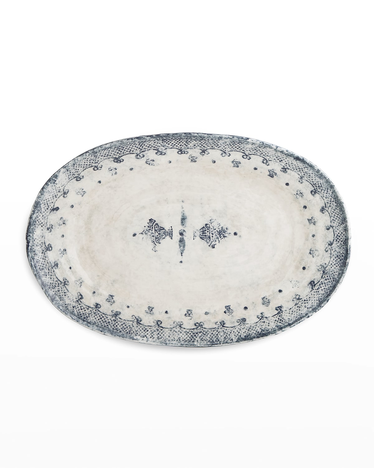 Oval platter made of Italian ceramic. Dishwasher safe; microwaveable. Approx. 20.3"L x 13.8"W x 2.5"T. Handmade in Italy.