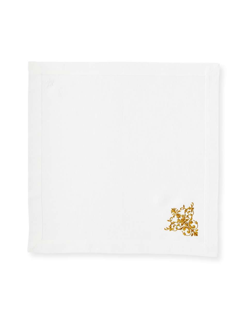 Decorative napkin features a decorative scroll motif at the corner Made of linen Approx. 22"Sq. Machine wash; line dry Set of four Made in Italy