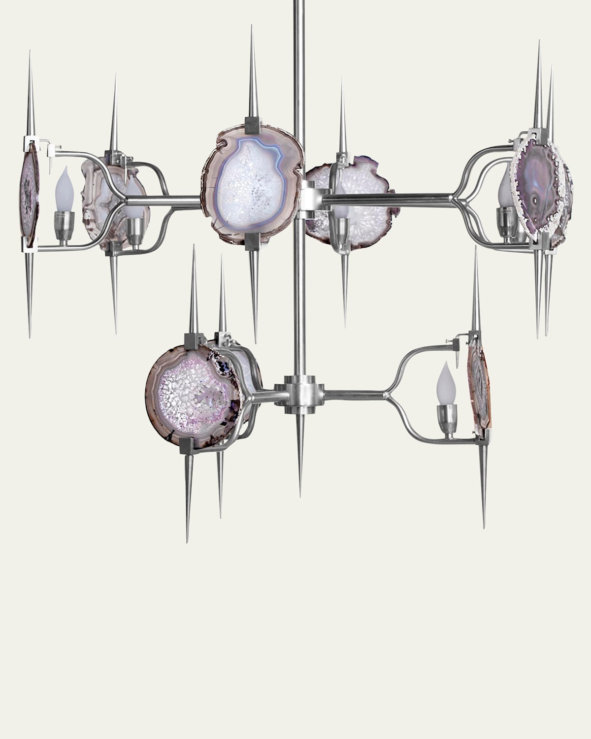 Our Eclipse Collection was where it all started. Our first and most loved lighting collection, featuring huge Brazilian Agate slices backlit to highlight the natural beauty of each unique piece. A sleek chandelier body is the perfect complement to the organic qualities of the natural agate slices. Stainless steel frame. Adjustable pipes: two 14", one 12", one 10", and one 6". Overall: 34"Dia. x 32.25"T. Uses nine 40watt candelabra bulbs (not included). UL listed. Weight: 27 lbs. Imported. Boxed weight, approximately 47 lbs.
