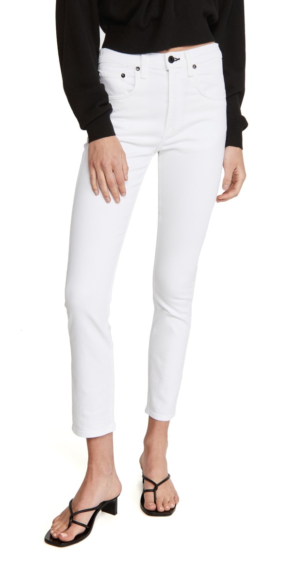 Fabric: Mid-weight stretch denim. High-waisted silhouette. Ankle length, skinny silhouette. Button closure and zip fly. 5-pocket styling. Shell: 98% cotton/2% polyurethane. Wash cold. Made in the USA. Measurements: Measurements from size 25 Rise: 10.25in / 26cm Inseam: 28.25in / 72cm Leg opening: 11.75in / 30cm