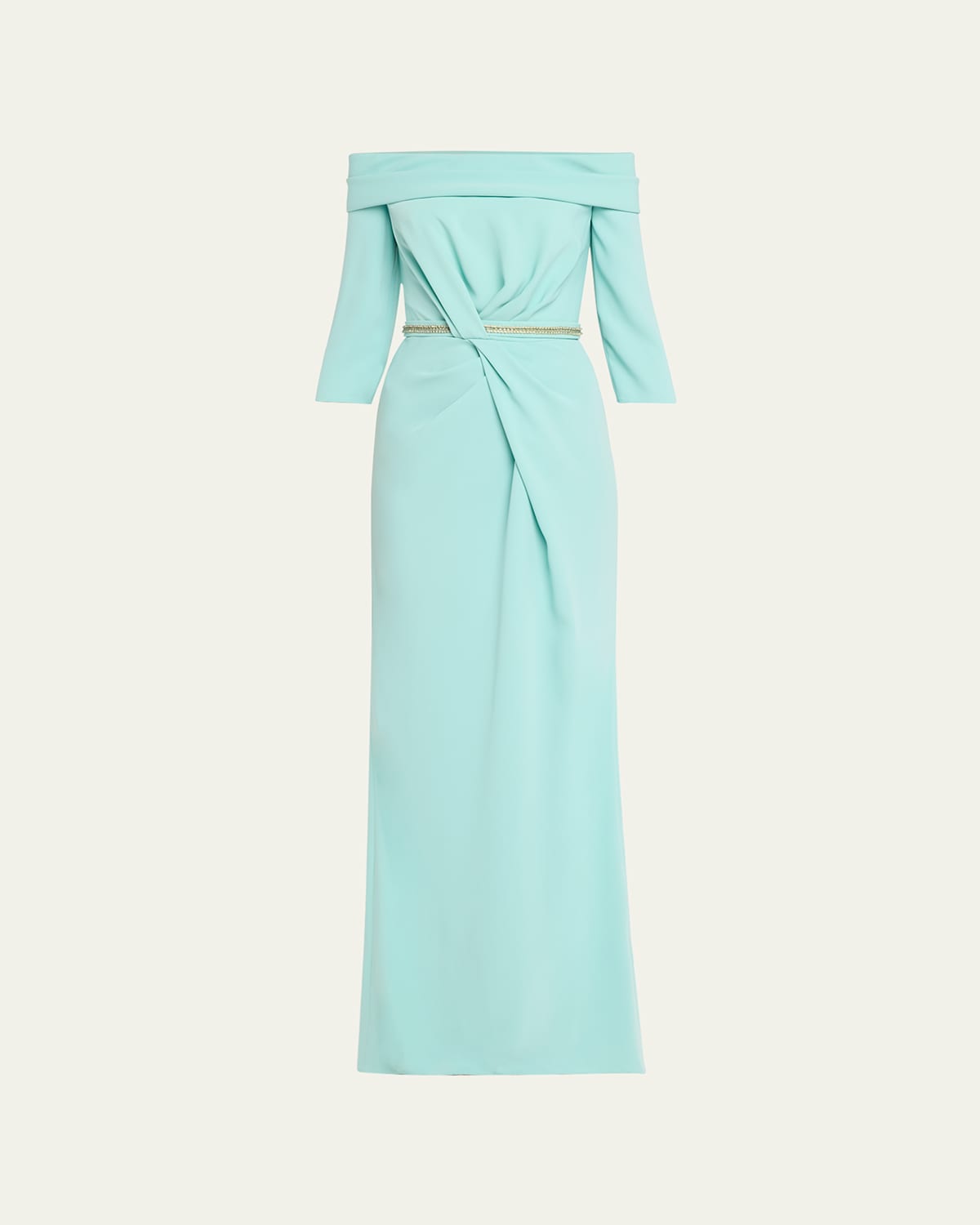 Judy Pleated Crystal-Embellished 3/4-Sleeve Off-The-Shoulder Gown