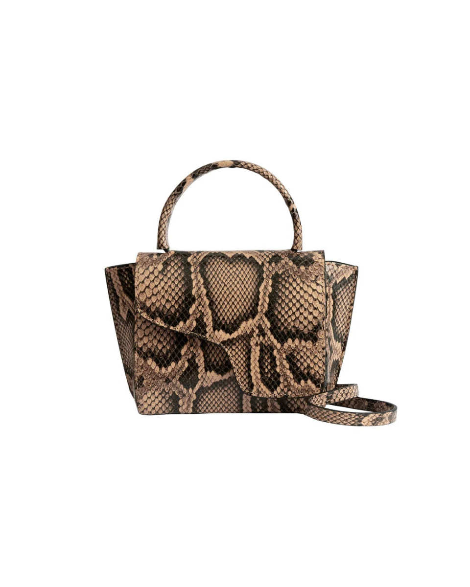 The Montalcino Nocciolla Printed Snake Handbag by ATP Atelier is a mini handbag featuring a crossbody strap and top handle with gold-toned hardware and magentic closure. #122734