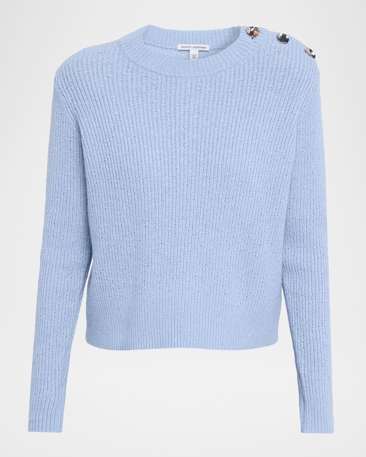 This Autumn Cashmere sweater is knit in a fancy shaker stitch with a metallic buttoned detail on the left shoulder Approx. 21"L from shoulders to hem Crew neckline Long sleeves; approx. 30.5"L Relaxed fit Pullover style Cashmere/cotton Imported