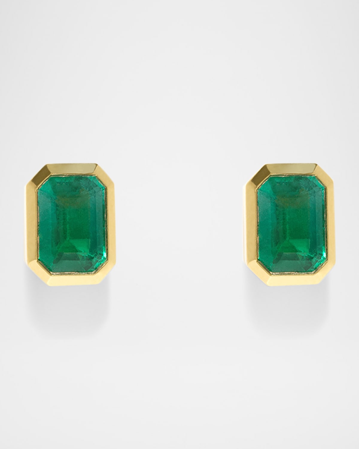 Rich, glowing green emeralds are used to craft these AZLEE studs. Polished 18karat yellow gold For pierced ears Made in USA