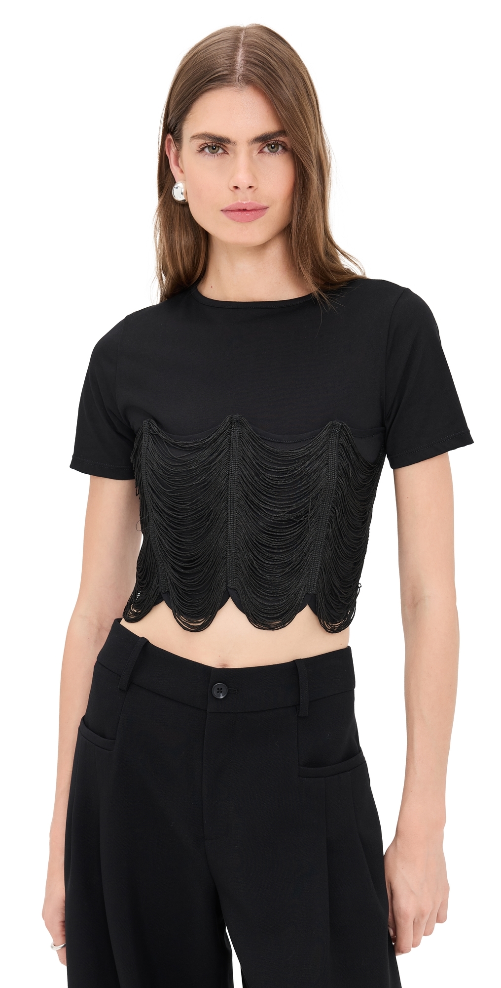 Fabric: Mid-weight stretch jersey. Corset overlay with scalloped fringed detailing. Crew neck. Short sleeves. Zip at back. Shell: 98% cotton/2% polyester. Lined. Lining: 100% viscose. Dry clean. Imported, Colombia. Measurements: Measurements from size XS Length: 16.25in / 41.0cm, from shoulder