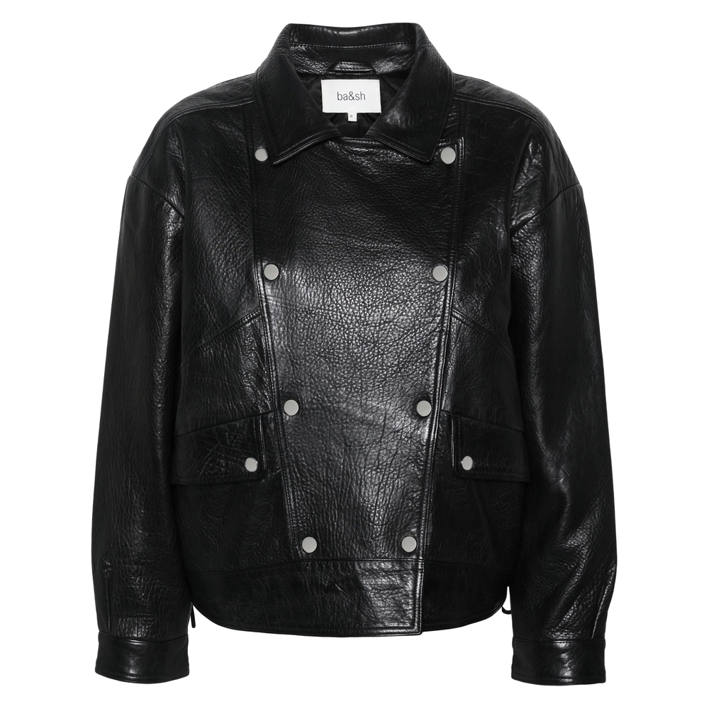 black lambskin pebbled texture wide notched lapels drop shoulder long sleeves press-stud fastening cuffs two front flap pockets side lace-up embellishment straight hem double-breasted press-stud fastening