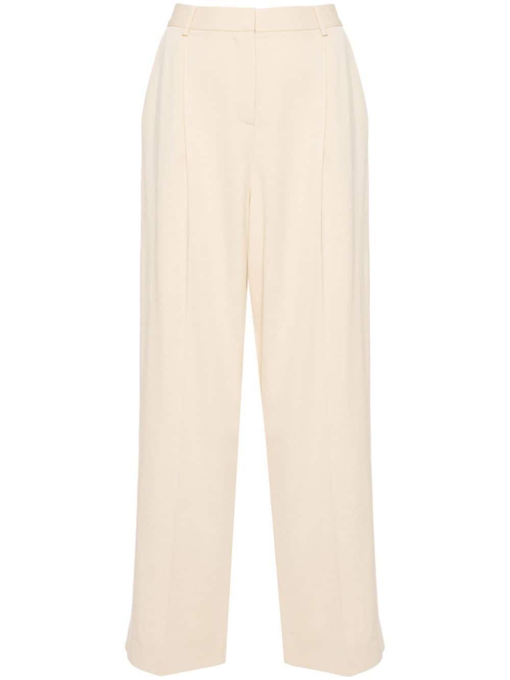 beige interlock weave belt loops pleat detailing pressed crease two diagonal pockets to the sides two rear welt pockets straight leg hook and zip fly fastening