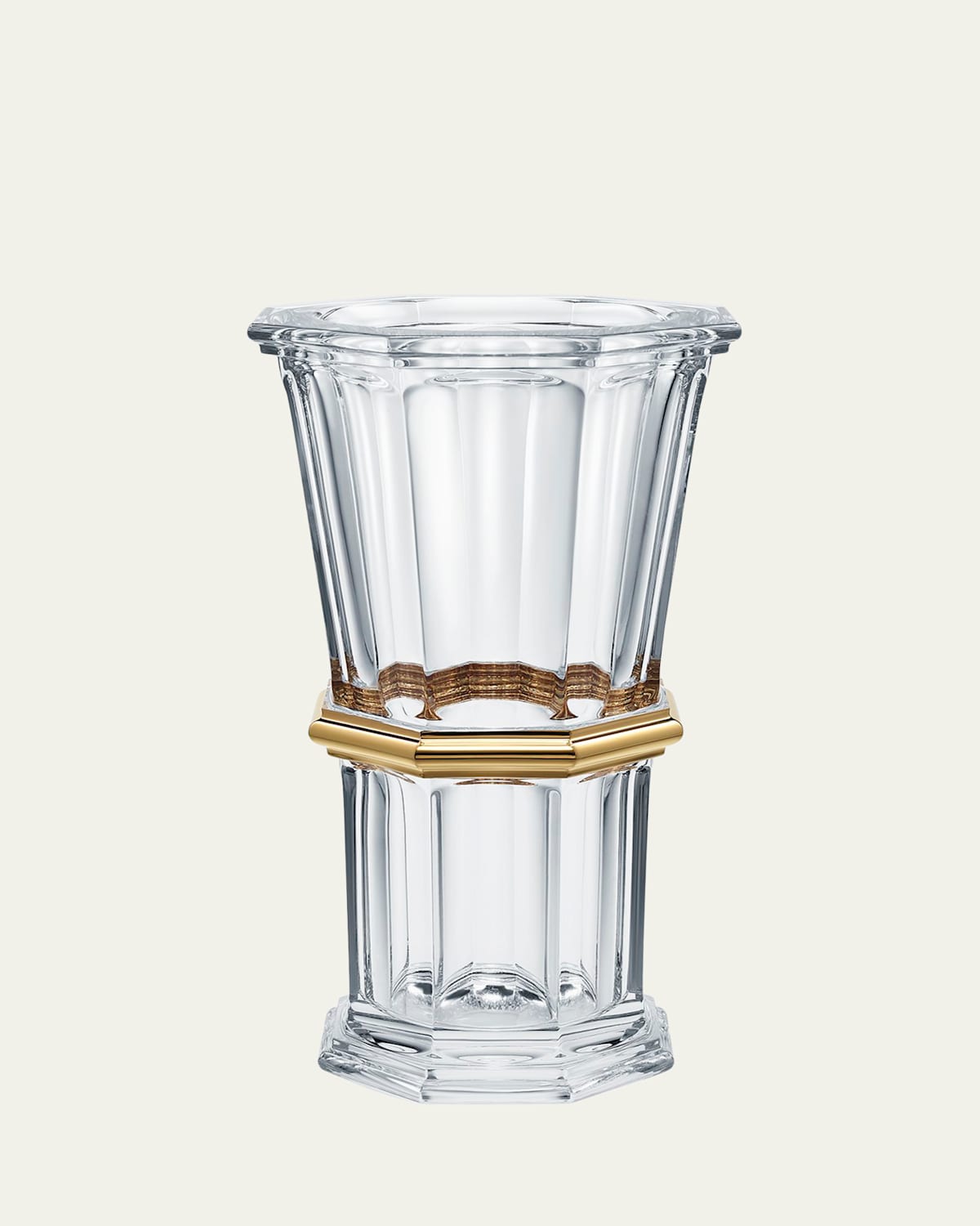 Handcrafted lead crystal vase features architectural style with its octagonal shape and cut facets. Hand painted 20karat yellow gold. Approx. 6.9"W x 12.62"T. Wipe with soft cloth. Made in France.