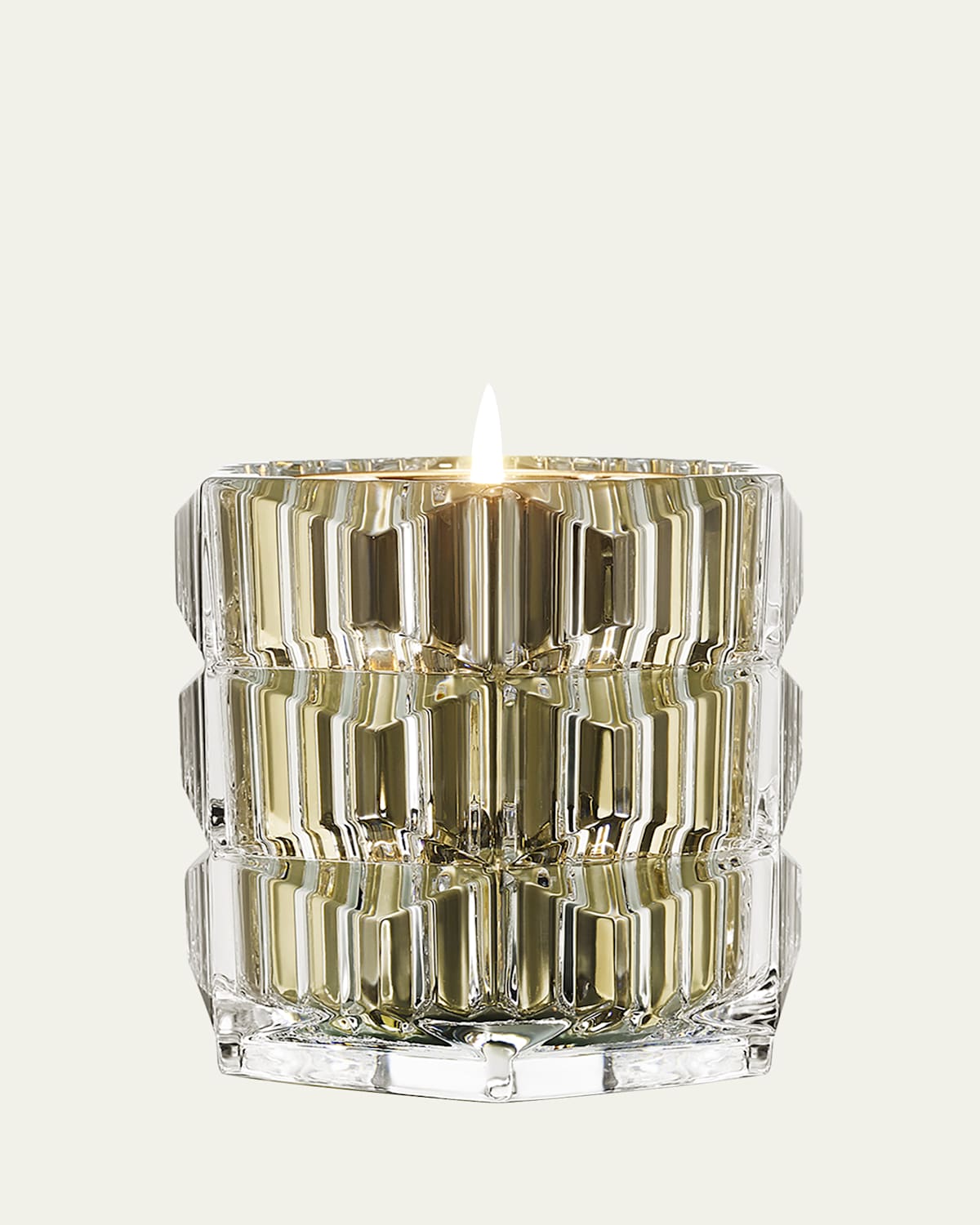 Candleholder made of geometrically cut crystal. Scented candle. Scent: top note: blood orange; middle notes: saffron and white oak moss; bottom notes: gray amber and clary sage.Burn time, approximately 4045 hours. Approximately 4.25"T. Made in France.